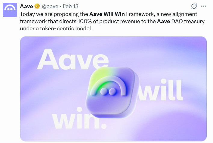 🤑 Aave Labs Unveils “Aave Will Win,” Directing 100% Revenue to Aave DAO: Aave Labs, the open-source, DeFi lending platform, has unveiled a new governance model, dubbed “Aave Will Win,” which commits 100% revenue generated from the Aave products to its DAO treasury.
