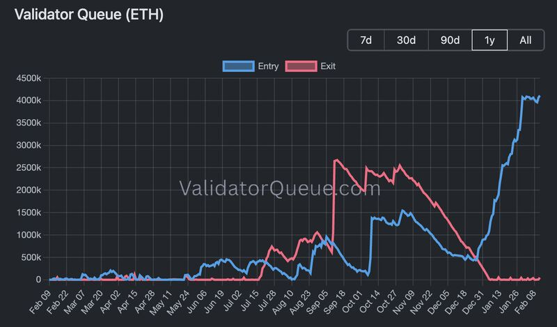 There is now 4.1M+ $ETH ($8.2B) waiting for staking activation, up 12% in the past two weeks alone and 362% since January 1st. At the same time, validator exits have trended towards 0.