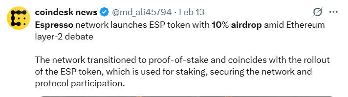 ☕ Espresso Launches ESP Token with 10% Airdrop: Espresso Network (ESP), the decentralized Proof-of-Stake platform on Ethereum, officially launched its ESP token on February 12. The launch rolls out a fully unlocked total supply of 3.59 billion ESP tokens and 10% community airdrop to eligible & active wallets.
