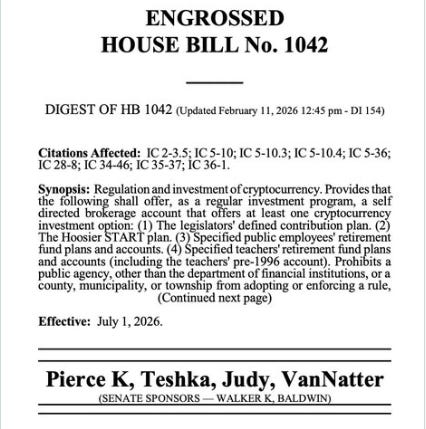 ⚖️ Indiana Advances Crypto for Public Pension Funds: Indiana State legislature advances cryptocurrency investments within public retirement plans after the Senate Committee cleared House Bill 1042.