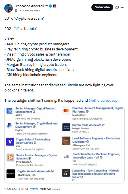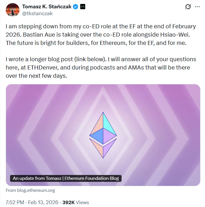 👔 Tomasz Stanczak To Step Down From Ethereum Foundation By Feb 2026: Tomasz Stanczak, Co-Executive Director at the Ethereum Foundation and the Founder of Nethermind, announced on February 13 that he will step down after serving one year in the role. Bastian Aue, with Hsiao-Wei, will take over as interim co-Executive Directors.