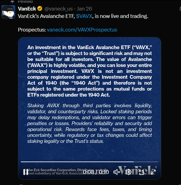 🚀 Avalanche Gets First US ETF As VanEck Debuts AVAX Fund: The first U.S. spot Avalanche (AVAX) exchange traded fund (ETF)—VAVX—from global asset manager and fund issuer VanEck began trading on the Nasdaq on Monday.