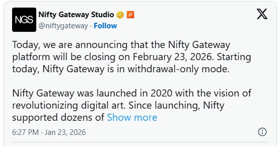 👋 Influential NFT Platform Nifty Gateway Set to Shut Down in February: Nifty Gateway, one of the most influential platforms of the early NFT boom, announced on Friday that it will shut down on February 23. The move blindsided many artists and collectors and reignited long-standing concerns around custodial platforms, centralization, and the long-term preservation of digital art.