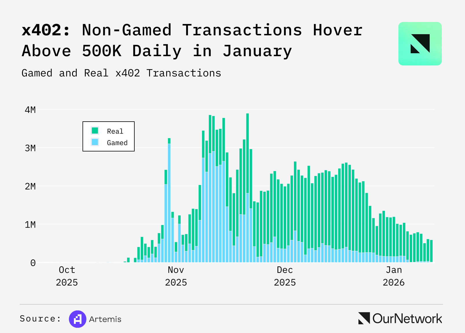 While the number of x402 transactions has trended downward somewhat, the number of non-gamed transactions has reduced to essentially zero.