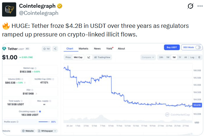 🥶 Tether Freezes $4.2 Billion Over USDT Crime Links: The world’s largest stablecoin company has reportedly frozen over $4.2 billion in USDT linked to crypto-related crimes. Earlier this week, Tether said it has assisted the U.S. Department of Justice in freezing around $61 million in USDT connected to “pig-butchering,” a type of crypto investment fraud, bringing its cumulative total of frozen assets to over $4.2 billion.