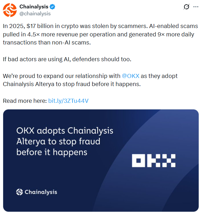 🤖 OKX and Chainalysis Roll Out Alterya, an AI-Powered Fraud Prevention Platform: The big players announced a major partnership to integrate Chainalysis’s AI-powered fraud detection platform, Altreya. The new AI-driven threat intelligence will instantly identify and block scam patterns before funds are transferred from the exchange.
