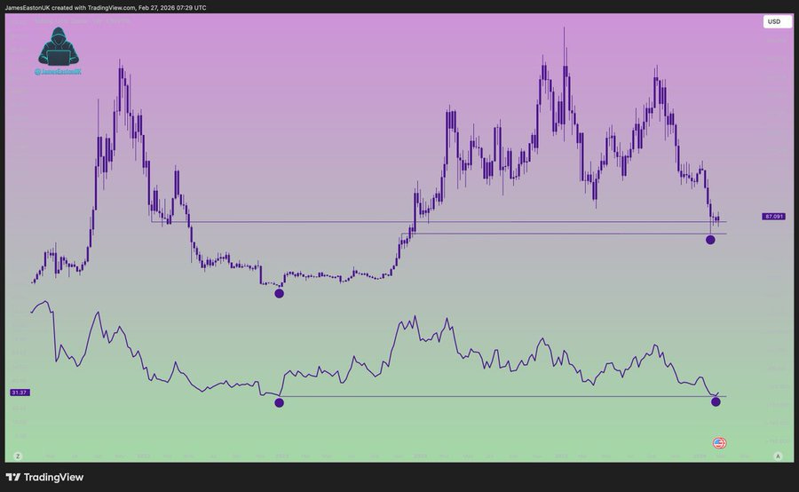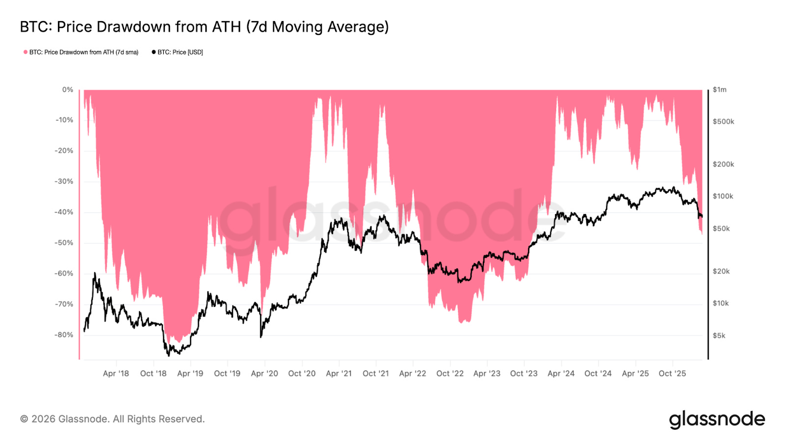 Bitcoin remains range-bound between $60k–$70k at a 47% drawdown from ATH, a depth historically aligned with mid-to-late bear market phases.