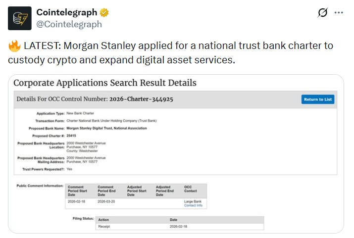 📜 Morgan Stanley Seeks OCC Charter for Crypto Custody: The global financial services company has filed an application with the Office of the Comptroller of the Currency (OCC) on February 18 for a de novo trust bank charter, called the “Morgan Stanley Digital Trust, National Association.” If approved, the new regulated crypto-native custodian will directly compete with industry-leading institutional crypto custodians like BitGo and Fidelity Digital Assets. The new full-service crypto platform plans to offer custody, trading, swaps, transfer, and fiduciary staking services under one roof.