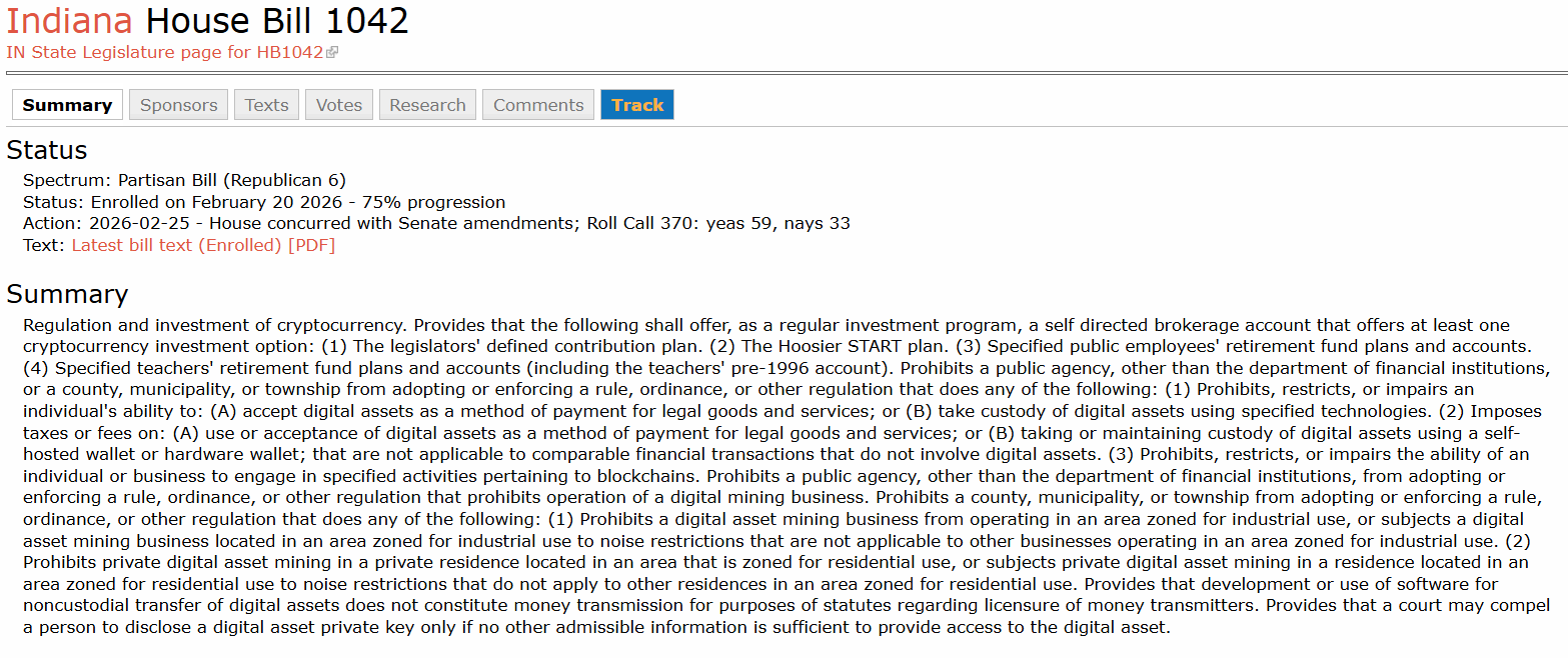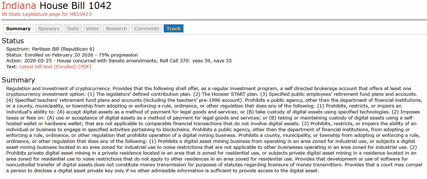 👴 Indiana Puts Bitcoin in its Public Retirement Plans: The Indiana state legislature has approved public retirement funds and savings to access digital assets and spot crypto ETFs in February. Governor Mike Braun is anticipated to sign HB1042 into law within the next few days.