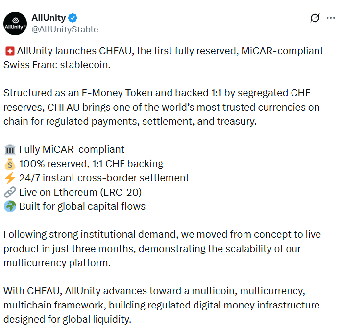 🎯 AllUnity Launches Swiss Franc Stablecoin, CHFAU: Frankfurt-based and BaFin-regulated e-money stablecoin platform AllUnity has launched its first fully MiCAR-compliant and 100% reserved stablecoin, CHFAU. The e-money token is 1:1 pegged with Swiss Franc reserves and aims to deliver institutional-grade transparency and regulatory oversight.