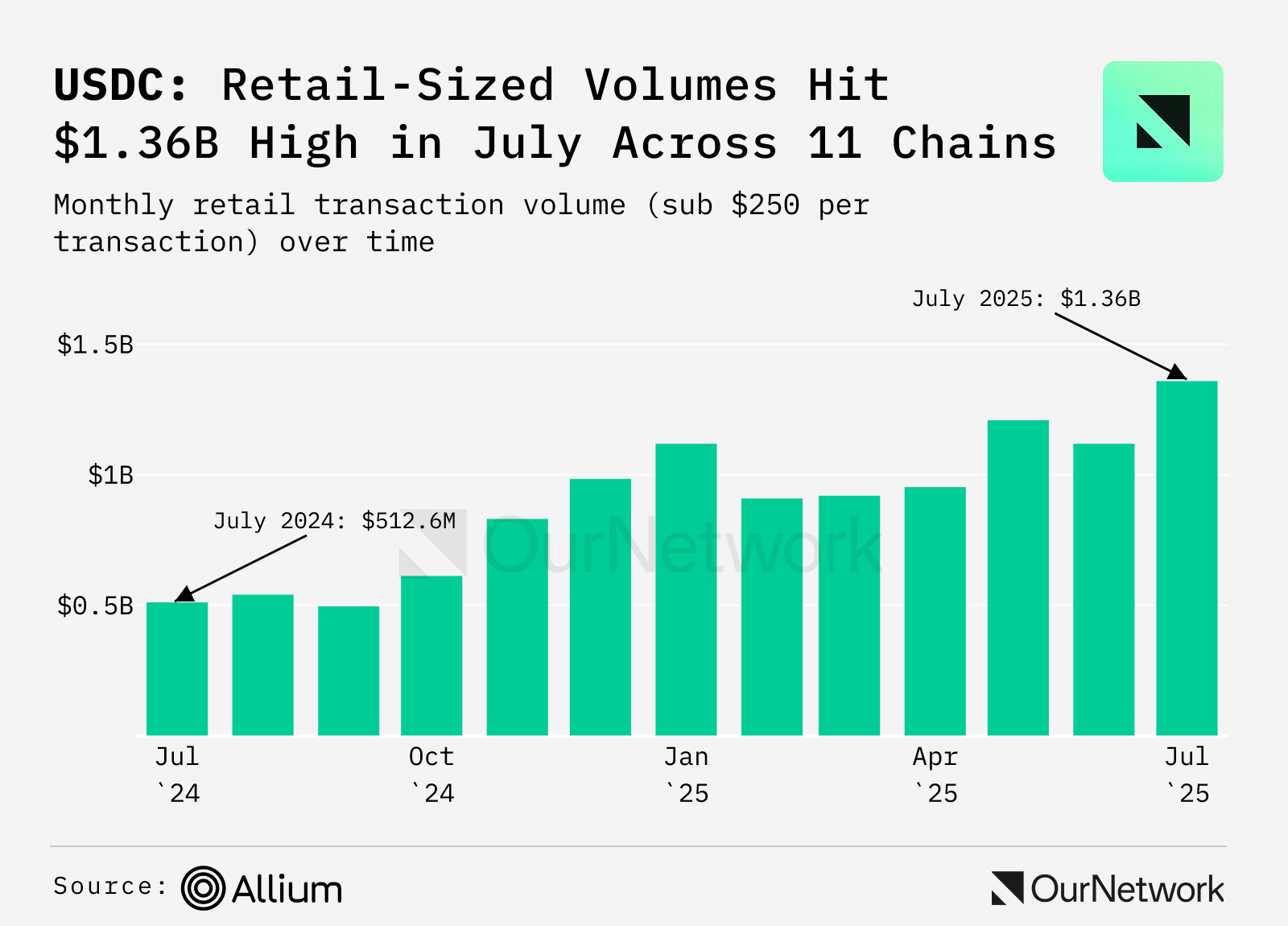 In July, retail-sized USDC volumes hit a record high of $1.37B across 11 networks. Solana led with 33% of these volumes, followed by Polygon at 17% and Arbitrum at 12%. Allium defines retail transactions as organic transfers under $250.