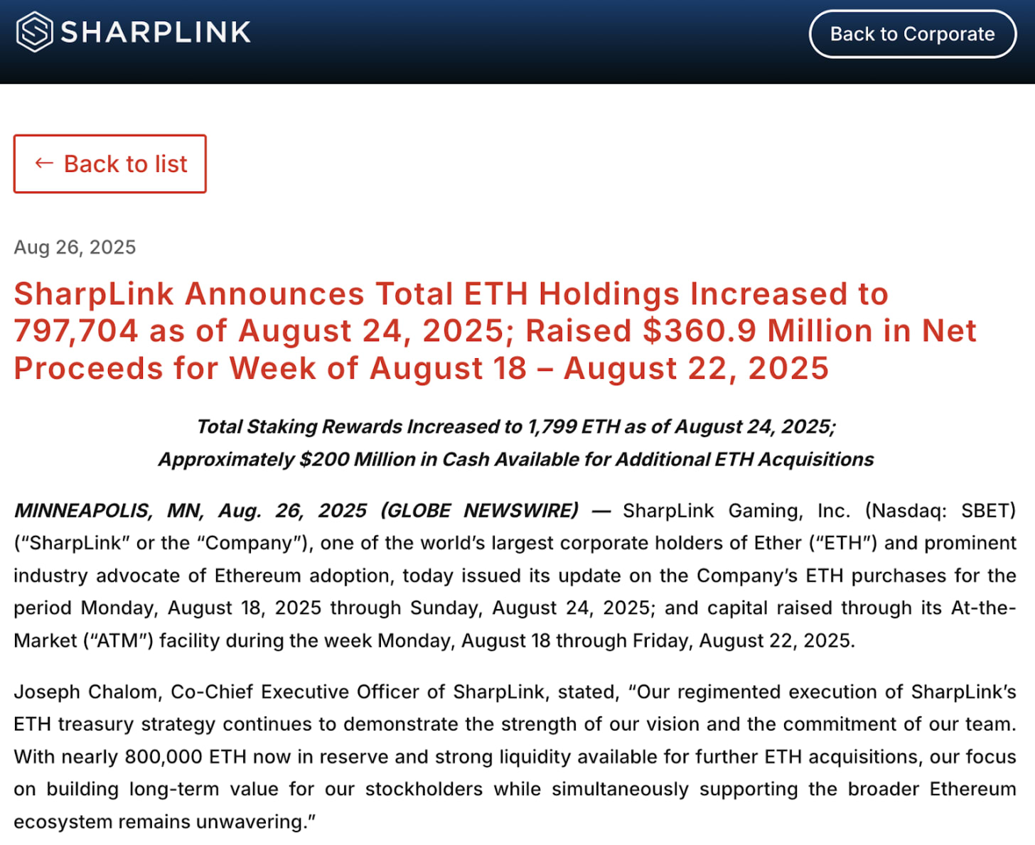👑 SharpLink ETH treasury at $3.6 billion after adding over 56,000 ether: SharpLink now holds 797,704 ETH after last week adding 56,533 ether for around $252 million; putting its Ethereum treasury valued at $3.64 billion.