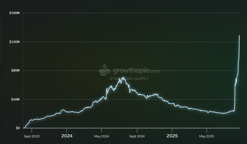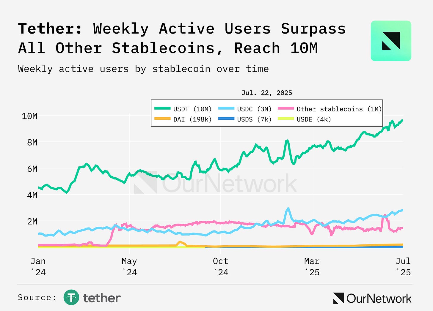 USDC, issued by Circle, is a fully-reserved stablecoin pegged 1:1 to the U.S. dollar and backed by cash and short-term Treasuries. As of August, supply reached a record $66.11B across 10 networks, including Ethereum, Solana, Base and Arbitrum. USDC supply is up 25% year-to-date. In July, cumulative transfer volumes reached $2.4T, with organic volumes hitting an all-time high of $345B, up 42% month-over-month.