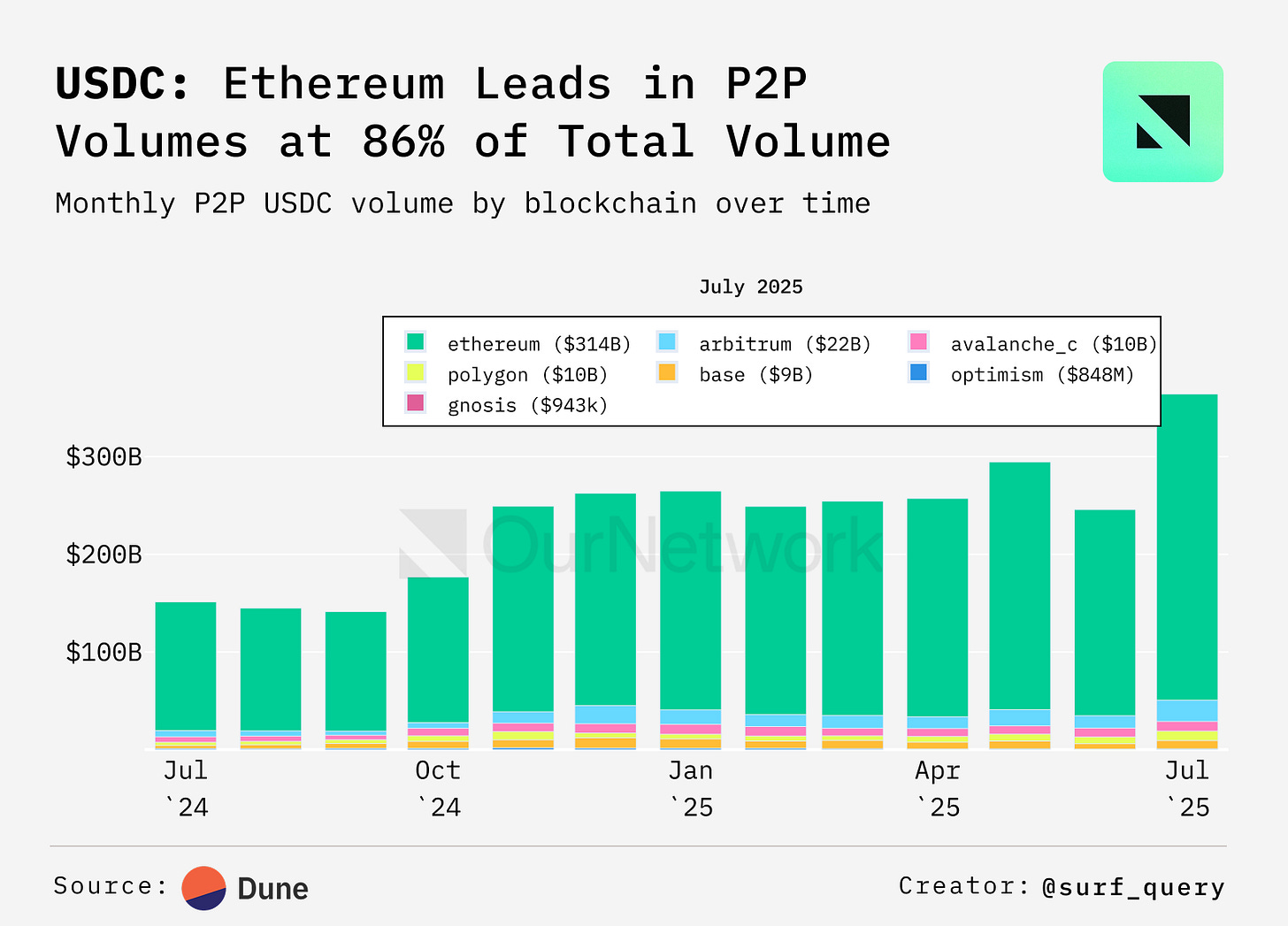 Lending and P2P remain core drivers of USDC usage. In July, P2P volumes across the seven Ethereum Virtual Machine networks reached a record $364B. Ethereum led with 86% of the total, followed by Arbitrum at 6%. Over the past 12 months, $106.2B in USDC was loaned out, with Aave accounting for 79% of that activity.