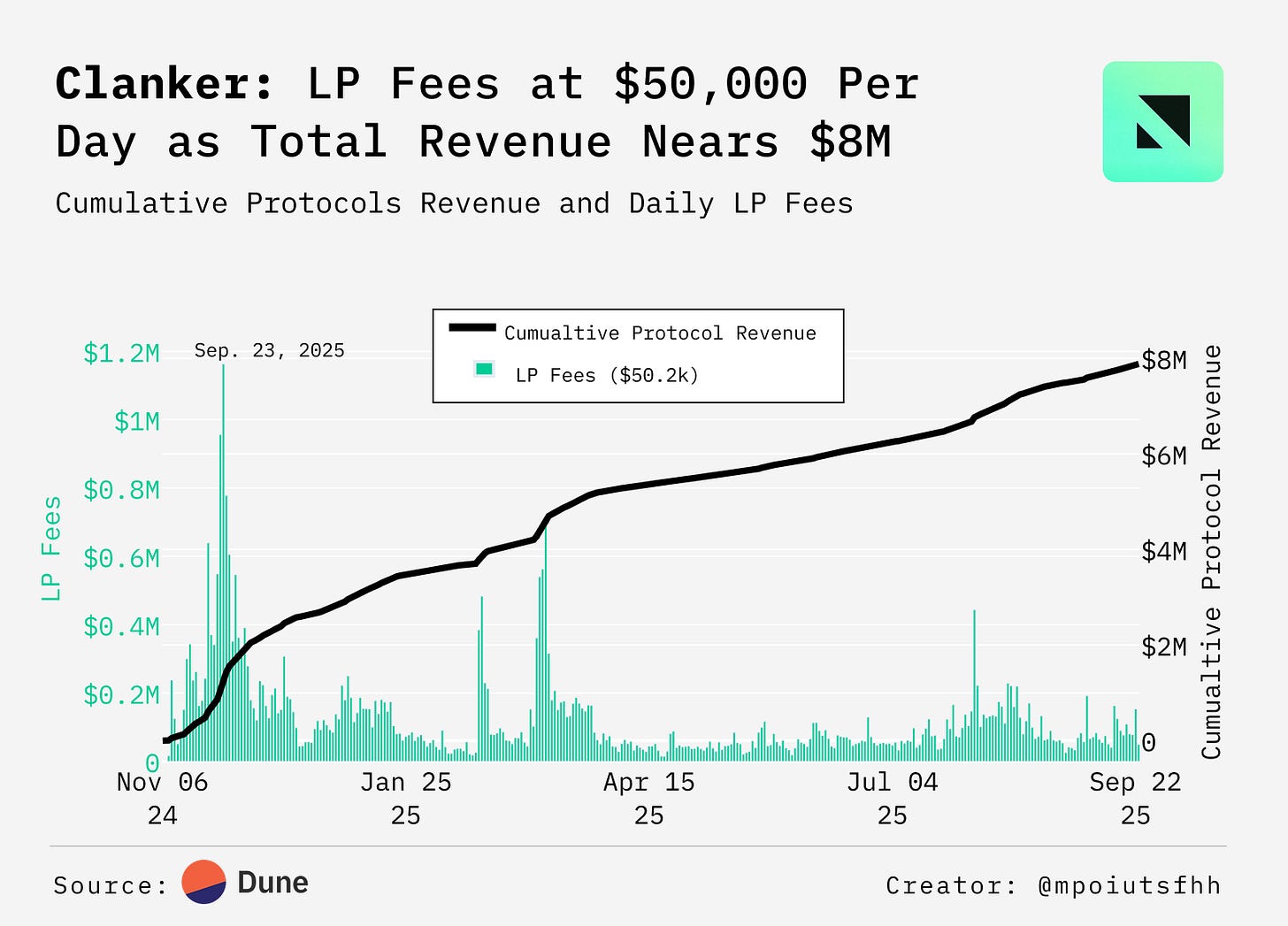 Clanker’s revenue model takes a flat 20% share of LP fees. Since launch, LPs have earned $39.4M, while the protocol captured $7.9M. This consistent cut via v4 hooks highlights how Clanker monetizes activity while still routing the majority of value to liquidity providers.