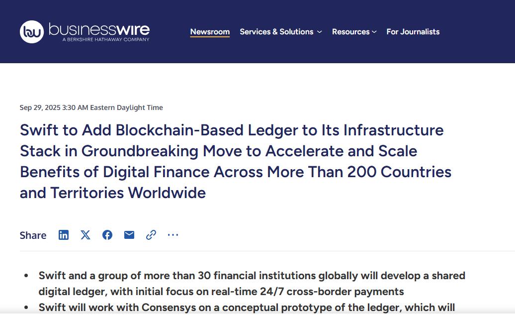 🚀 Swift Teams With Ethereum Software Giant Consensys for Blockchain Prototype: Global financial messaging network Swift announced that it will incorporate a blockchain-based shared ledger into its infrastructure stack. The initiative’s first focus will be on a real-time, 24/7 cross-border payment use case. Swift said in the release that it will officially design the shared ledger based on a “conceptual prototype” Swift developed with Consensys.