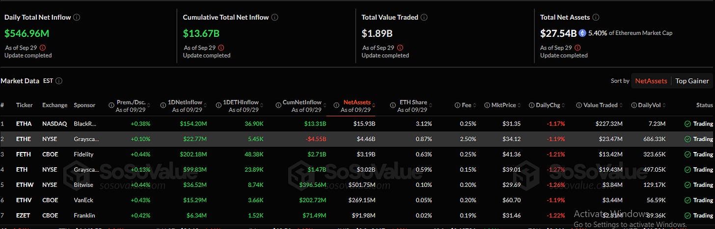 📉 Spot Ethereum ETFs see largest outflow week since inception:The ETFs saw a combined $795.6 million worth of outflows for the week ending Sept. 26, according to SoSoValue data, with over $10 billion in trading volume. The outflows just outpaced the second-worst week for the funds, the week ending Sept. 5, which saw $787.7 million worth of outflows.