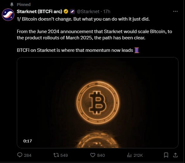 🚀 Starknet introduces bitcoin staking and yield product in BTCFi expansion:Bitcoin staking has gone live on Starknet, which the project describes as the first trustless way can be staked on a Layer 2. Holders can earn rewards while keeping custody of their assets and helping secure the network’s consensus process — a move Starknet has branded the “bitcoin strategy for OGs.”
