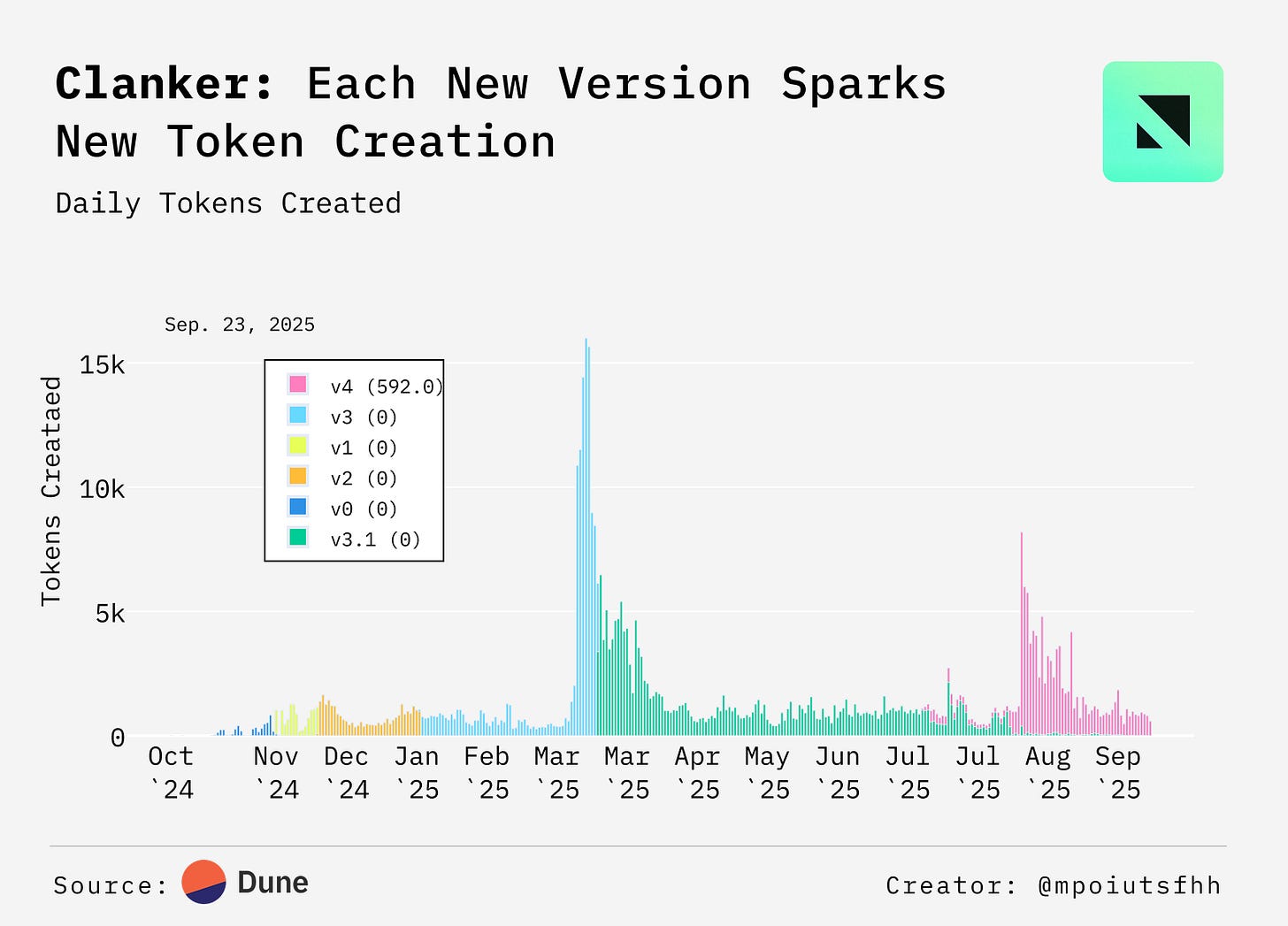 Each new version release sparked a surge in token creation: v3 peaked near 16k daily tokens, v3.1 drove another major wave, and v4 added fresh momentum. In total, over 456k tokens have been launched, showing how iteration cycles power Clanker’s growth.