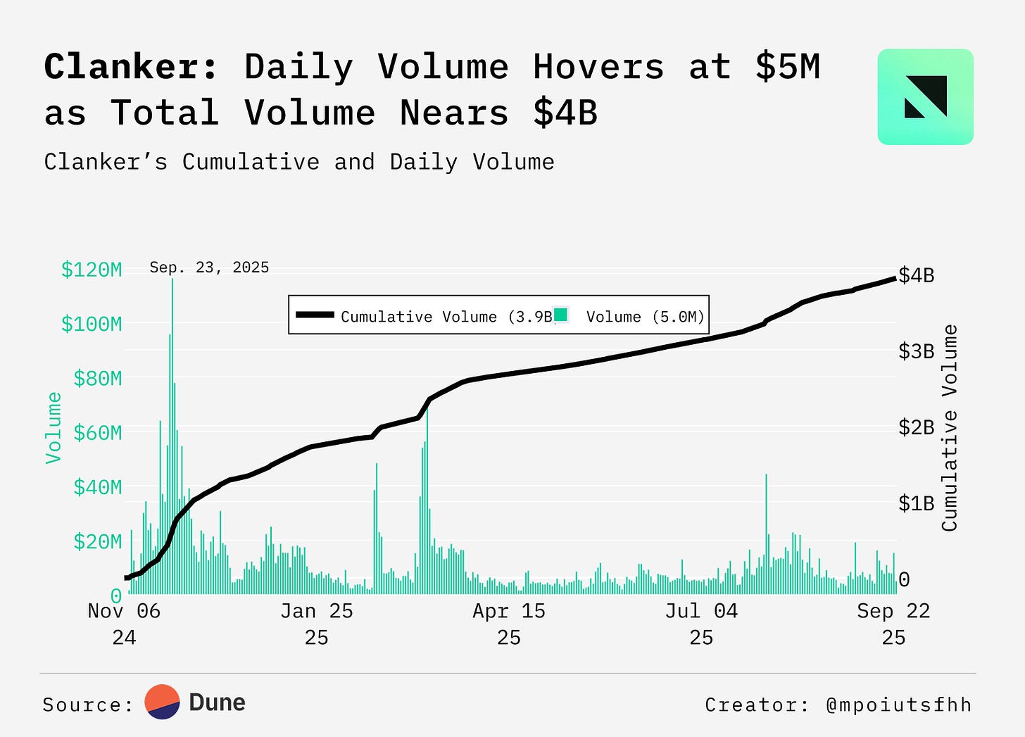 Clanker’s fourth version marked a turning point as it rebuilt on Uniswap v4, introducing hooks for dynamic fees, automated buybacks, vaulting, and MEV protection. Since launch, the protocol has processed $3.9B, with 65% of volume in 2025 alone. Daily activity peaked at $116M during rollout and now averages above $10M per day, showing Clanker has matured into durable launch infrastructure.