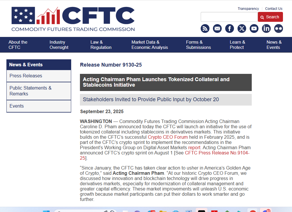 ⚖️ CFTC launches initiative to enable stablecoins as derivatives market collateral:Commodity Futures Trading Commission (CFTC) Acting Chairman Caroline Pham announced on Sept. 23 that the agency will launch an initiative to enable tokenized collateral in derivatives markets, including stablecoins.