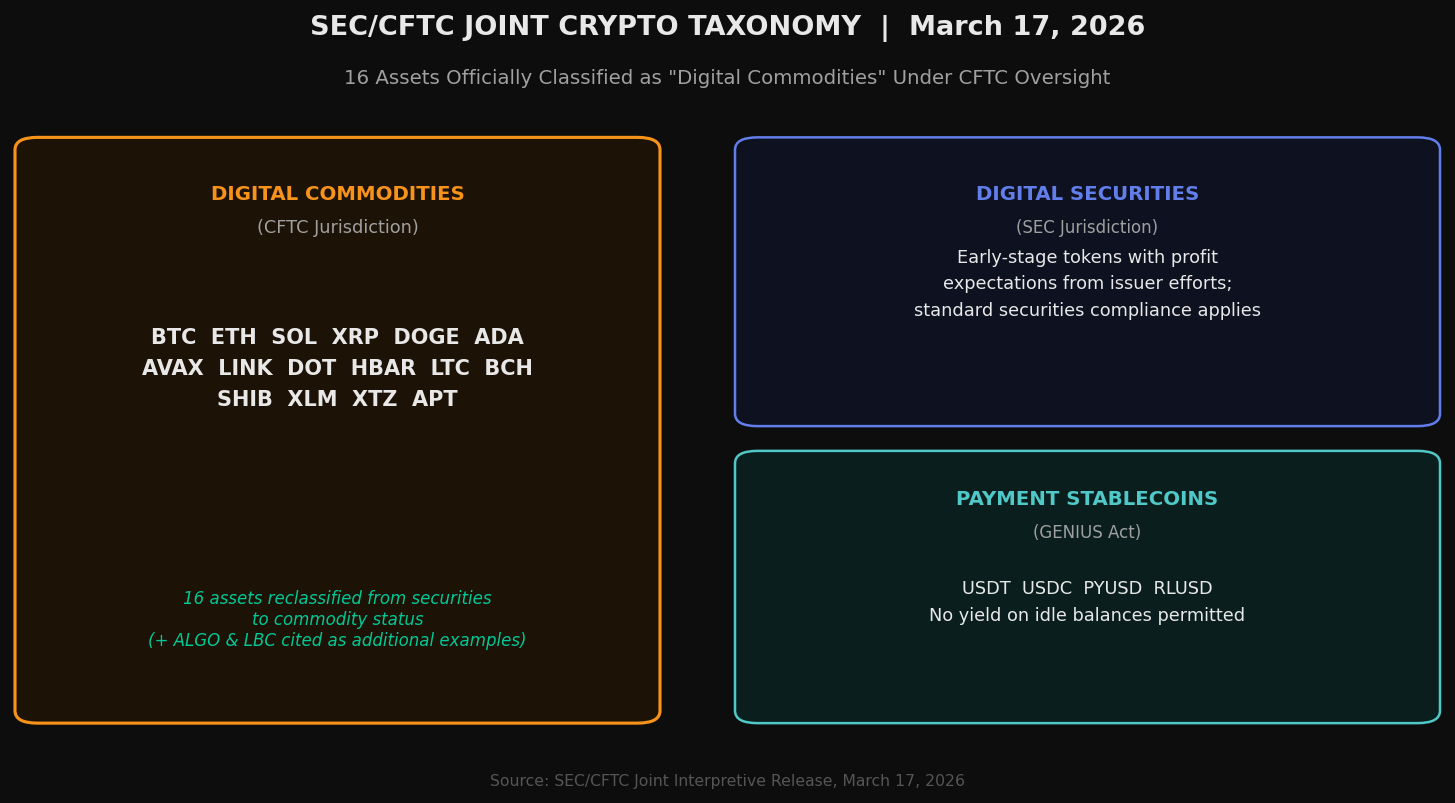 The SEC, in coordination with the CFTC, released a landmark 68-page regulatory taxonomy on March 17, explicitly naming 16 cryptocurrencies as âdigital commoditiesâ under CFTC oversight, with Algorand and LBRY Credits cited as additional examples, citing the most significant U.S. regulatory development in crypto history.