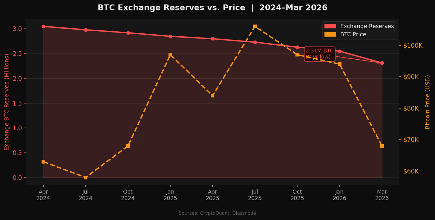 Bitcoin exchange reserves fell to approximately 2.31 million BTC, the lowest level since April 2018, as long-term holders continue moving coins into self-custody at a historically elevated pace.
