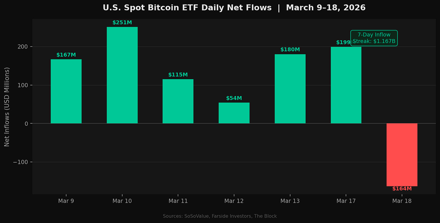 What happened: The Federal Reserve held rates steady at 3.50%-3.75% on March 18, as expected. The updated dot plot maintained the December projection of one rate cut in 2026, unchanged at the median, but the balance of individual projections shifted marginally more hawkish, with seven FOMC members now projecting no cuts versus six in December. More materially, the committee revised its 2026 core PCE inflation forecast upward from 2.5% to 2.7%, and Powell said during the press conference that the Fed has ânot made as much progress on inflation as it had hoped,â pointing to elevated oil prices from the Middle East conflict as a key uncertainty. Bitcoin dropped sharply in the hours following Powellâs remarks. U.S. spot Bitcoin ETFs recorded $163.5 million in net outflows on March 18, ending seven consecutive days of inflows that had totaled $1.167 billion from March 9 through March 17. Fidelityâs FBTC led outflows at $103.8 million, followed by BlackRockâs IBIT and Grayscaleâs GBTC.