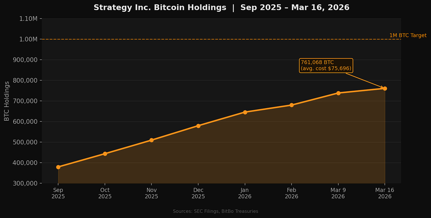 BTC, as of March 15, acquired at an average cost of $75,696 per BTC for a total of approximately $57.61 billion. The company is targeting 1 million BTC by year-end, which would require purchasing approximately 5,700 BTC per week for the remainder of 2026.