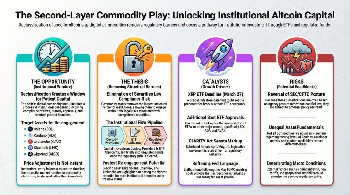 When 16 crypto assets are officially reclassified from securities risk to commodity status, the repricing is not instantaneous. Institutional capital moves through compliance reviews, custody approvals, and product launches, all processes that take weeks to months, not hours. This creates a window where assets like Solana, Cardano, Avalanche, Chainlink, and Algorand are legally reclassified, but institutional infrastructure has not yet caught up. Historically, this type of regulatory de-risking event, where the legal barrier drops before the institutional flow arrives, has represented a durable entry point for patient capital.